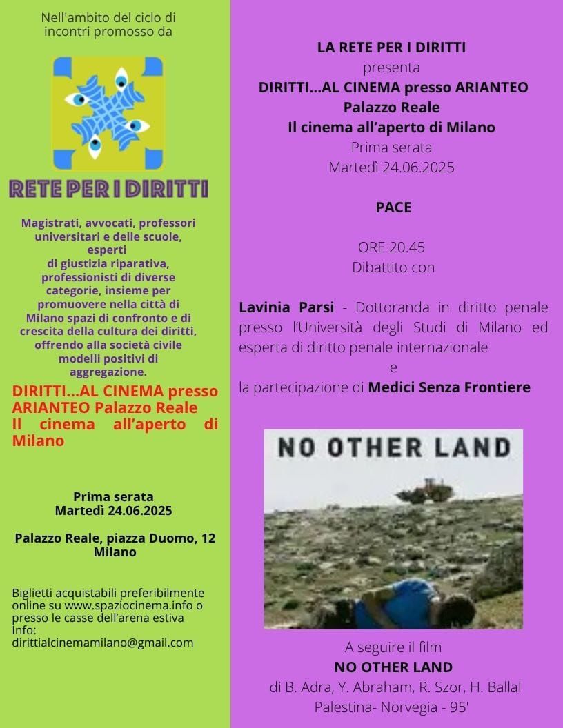 On June 24, the documentary No Other Land by B. Adra, Y. Abraham, R. Szor, and H. Ballal — winner of the 2025 Academy Award for Best Documentary — will be screened at ARIANTEO Palazzo Reale. The screening is part of the film series “Diritti… al Cinema”, promoted by the Rete per i Diritti (Network for Rights).