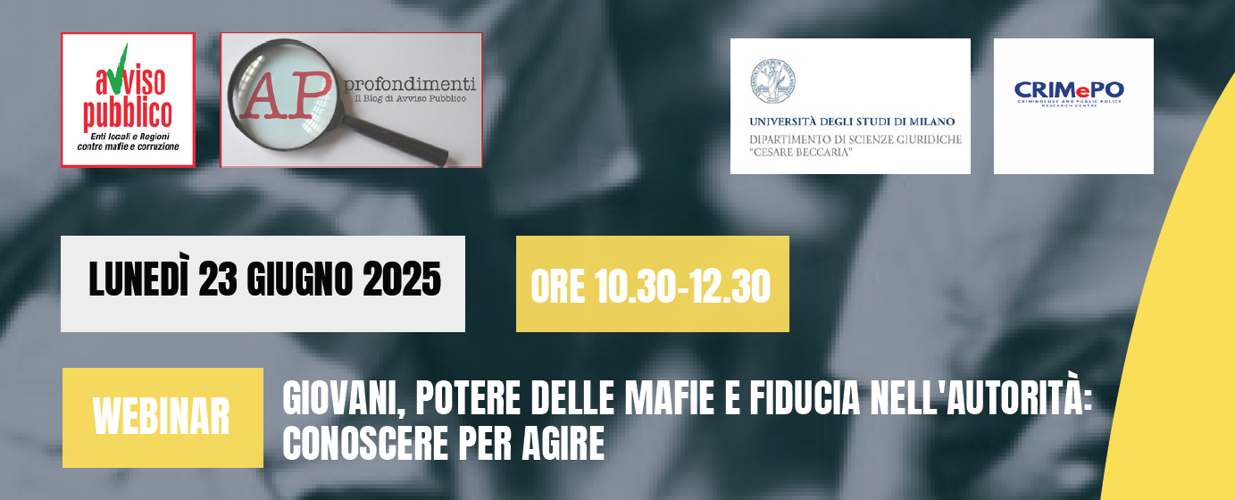 On Monday, June 23, from 10:30 AM to 12:30 PM, the webinar titled “Young people, mafia power and trust in authority: knowing to Act" will be held. This event is promoted by Avviso Pubblico, within the framework of the AP-profondimenti, in collaboration with the University of Milan and the Centre for Research in Criminology and Public Policy (CRIMePO). The webinar arises from the need to critically reflect on the role of mafias within contemporary society and the trust that young people place in institutions.