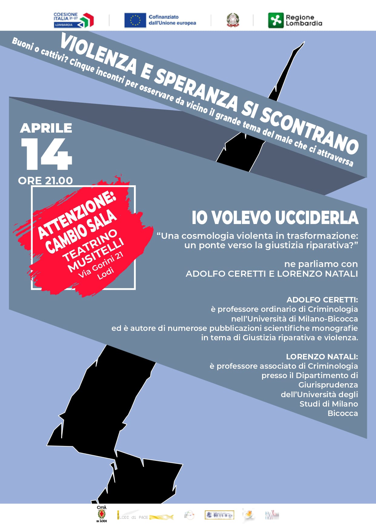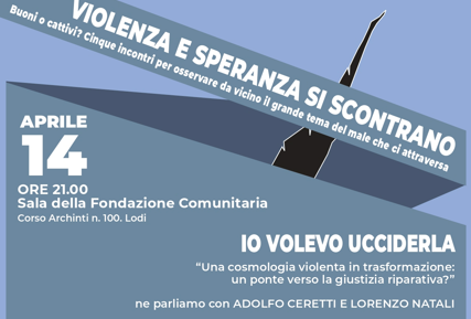 Il 14 aprile presso la Sala Fondazione Comunitaria di Lodi si terrà il quinto e ultimo incontro della rassegna Violenza e speranza si scontrano. Buoni o cattivi? Cinque incontri per osservare da vicino il grande tema del male che ci attraversa organizzata dall’Ufficio di Piano di Lodi, dal titolo “Io volevo ucciderla. Una cosmologia violenta in trasformazione: un ponte verso la giustizia riparativa?”. I criminologi Adolfo Ceretti e Lorenzo Natali, entrambi professori di Criminologia presso L’Università degli Studi di Milano-Bicocca, discuteranno il tema in oggetto.