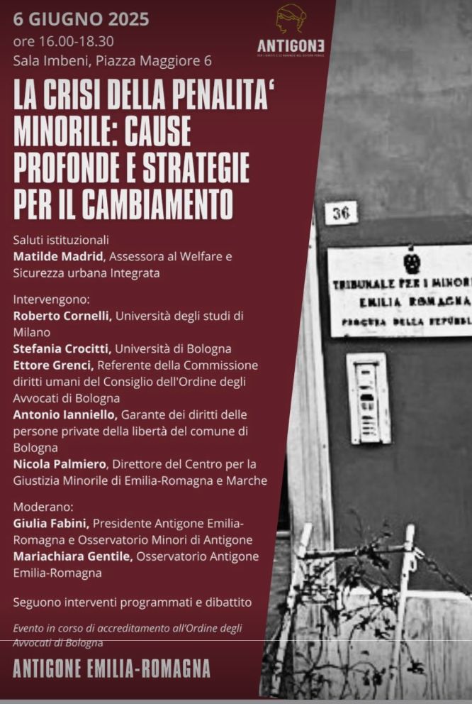 Il 6 giugno 2025, a partire dalle ore 16, si terrà a Bologna il convegno “La crisi della penalità minorile: cause profonde e strategie per il cambiamento”, un’occasione per riflettere sulle gravi criticità che attraversano oggi il sistema penale minorile in Italia. L’aumento del ricorso alla detenzione, le condizioni inadeguate delle strutture, l’assenza di percorsi realmente educativi e l’insufficienza di misure alternative stanno mettendo in discussione il senso stesso della giustizia minorile, nata per tutelare e rieducare.
